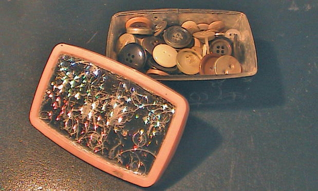 When we lived in Hollywood we had this neighbor named Meg and one day between 1994 and 1999 I don’t remember when, Darrin gave this box to her without my permission. He didn’t realize that this box of buttons, as insignificant as it may seem, meant a lot to me because it was my moms box of buttons. I felt like I couldn’t ask for it back because I don’t ask for a gift back after it was given. So basically, I lost it forever. Meg passed away in 2000 soon after we moved to Bakersfield and when we went to her house it had been ransacked and I never saw the box again.