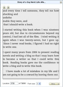 The paper book got put together and turned in to check for errors, which I’m happy to report weren’t any. I converted the .odt file to epub and was going to publish to Amazon for the Kindle and Barnes & Noble for the Nook. It looked great on the Nook, but the Kindle wasn’t doing so good. Here is what I was seeing…