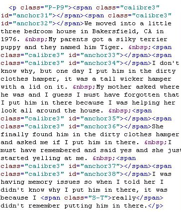 That is supposed to be a little paragraph. Those <.span.> things were out of control. That is what was causing the text to move down. So the only way for this to work is to cut all that crap out. I tried to do find and replace, but unfortunately each one of those lines has its own number so it’s not like I can replace all of them throughout the entire document, they have to be deleted one at a time. ANNOYING!