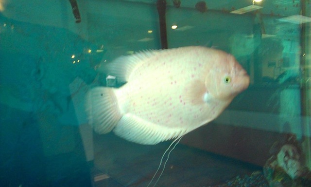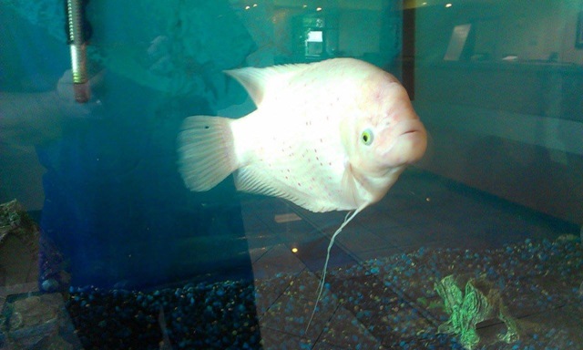 Just before I went to get my x-ray I saw this humungous fish in a very large fish tank by the back door. My first thought was holy cow that’s a big fish. As I left, I took my phone out to take a picture, but first I reached my finger to the tank as if I were petting him, or the tank, and he rammed the glass while trying to chomp my fingers off as if they were inside the glass. Holy crap that was an aggressive fish lol. I pulled my hand away and he was looking straight at me. He wouldn’t look at anything else, so to get him to turn so I could take the picture I had to put my right hand out to my side so he would turn his body. Here are 2 pictures of the fish below. You can see my reflection in the glass so you can use that as a scale.