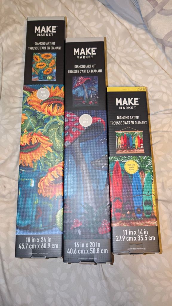 I have been seeing a lot of videos on YouTube of people sharing their “stash” as they call it, of Diamond paintings. Their stash being Diamond paintings that they bought, but are still sitting in their box waiting to be made. One person had 73 Diamond paintings, and they aren’t cheap either. A lot of them are Diamond Art Club which cost $60 and up. Other people had more and I was thinking whoa, that’s crazy. And now look at me. I still have about eight or nine Diamond paintings from Amazon and I’m still working on the last Temu Diamond painting and now I have all of these Make Market Diamond paintings from Michaels. I thought my stash was huge until I saw that that one person has 73.