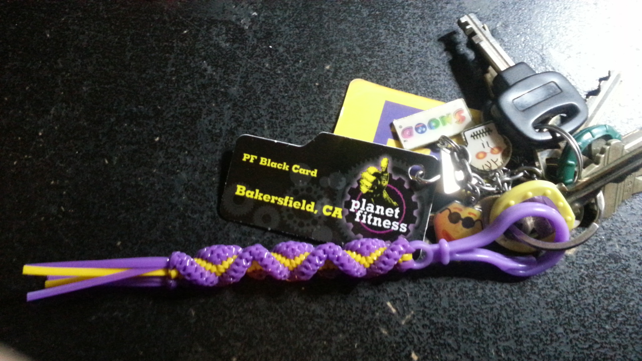 Anyway, I am totally excited. I made a new keychain (image above) that is purple and yellow to match the colors and I went to the store and bought some empty shampoo and body wash containers so we can shower after our workouts. I also bought 2 new puffy thingamabobs. That’s the technical term. They’re both purple for Planet Fitness’ colors lol. I also bought a brand new combination lock for $5 and 2 sports bottles so we can drink some water during our workouts. Oh and I also bought new purple shoe laces lol. My old red ones from Bank of America were worn out and I needed a change anyway.